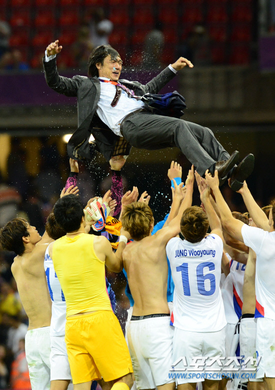 대한민국 올림픽축구 대표팀 선수들이 10일 오후(현지시각) 영국 카디프 밀레니엄 스타디움에서 열린 일본과의 경기에서 동메달을 딴 후 홍명보 감독을 헹가레 치고 있다.