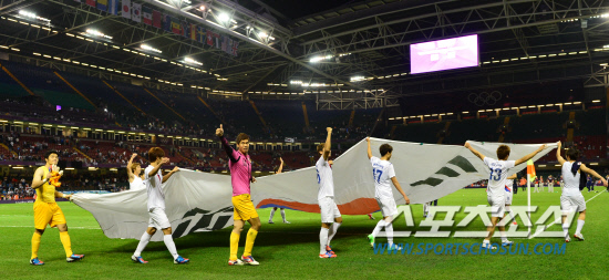 대한민국 올림픽축구 대표팀 선수들이 10일 오후(현지시각) 영국 카디프 밀레니엄 스타디움에서 열린 일본과의 경기에서 동메달을 딴 후 대형 태극기를 들고 운동장을 돌고 있다.