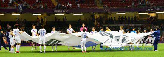 대한민국 올림픽축구 대표팀 선수들이 10일 오후(현지시각) 영국 카디프 밀레니엄 스타디움에서 열린 일본과의 경기에서 동메달을 딴 후 대형 태극기를 들고 환호하고 있다.