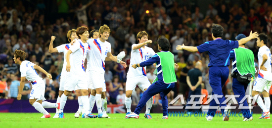 대한민국 올림픽축구 대표팀 선수들이 10일 오후(현지시각) 영국 카디프 밀레니엄 스타디움에서 열린 일본과의 경기에서 동메달을 딴 후 환호하고 있다.