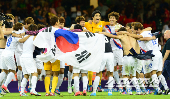대한민국 올림픽축구 대표팀 선수들이 10일 오후(현지시각) 영국 카디프 밀레니엄 스타디움에서 열린 일본과의 경기에서 동메달을 딴 후 환호하고 있다.