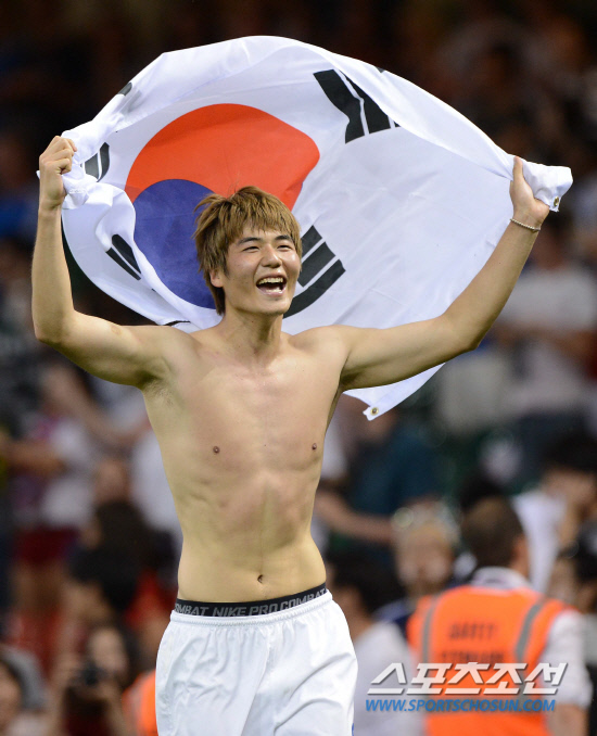 올림픽 축구대표팀 기성용이 10일(현지시간) 영국 카디프 밀레니엄 스타디움에서 열린 일본과의 경기에서 동메달을 획득하고 태극기를 두르고 기쁨의 세리머니를 하고 있다.