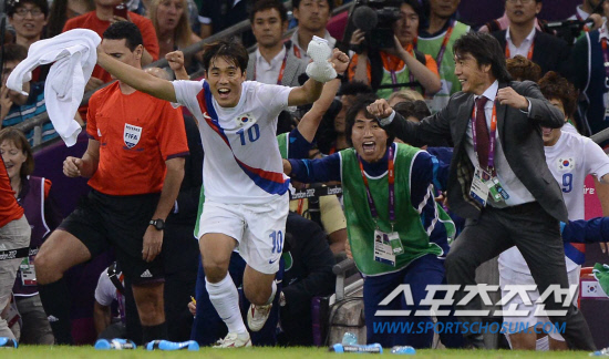 올림픽 축구대표팀 홍명보 감독과 박주영이 10일(현지시간) 영국 카디프 밀레니엄 스타디움에서 열린 일본과의 경기에서 동메달을 획득하고 환호하고 있다.