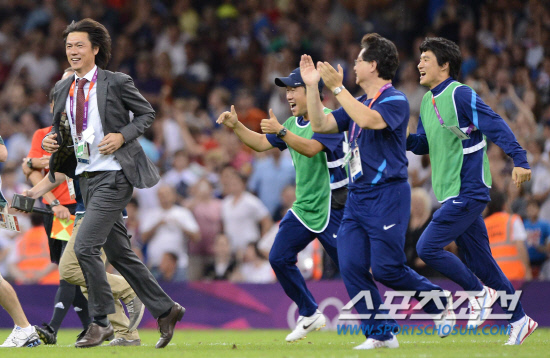 [런던포토] 선수처럼 달려나가는 홍명보 감독, 얼마나 기뻤으면!