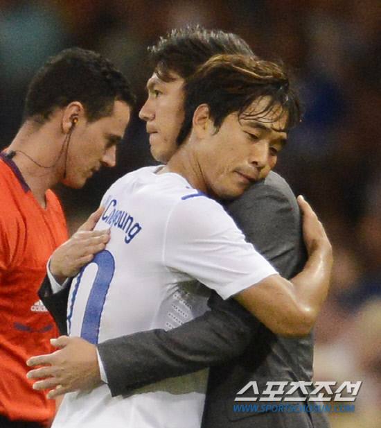 올림픽 축구 대표팀이 10일 오후 (현지시간) 영국 카디프 밀레니엄 스타디움에서 일본과의 2012 런던올림픽 축구 동메달 결정전에서2-0으로 완승 한국 올림픽 사상 첫 동메달을 획득했다. 값진 동메달을 획득한 선수들이 밀레니엄 스타디움에서 홍명보 감독이 박주영 선수와 포옹하고있다