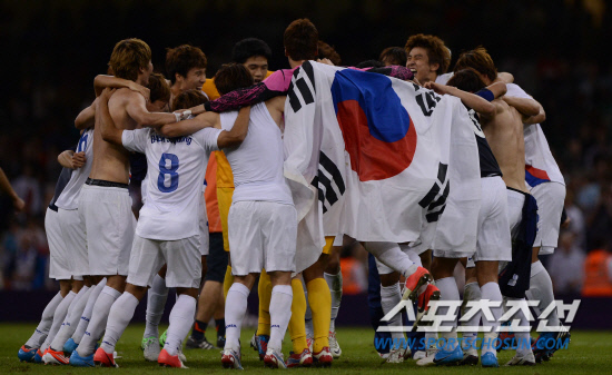 올림픽 축구대표팀 선수들이 10일(현지시간) 영국 카디프 밀레니엄 스타디움에서 열린 일본과의 경기에서 동메달을 획득하고 태극기를 두르고 기쁨을 나누고 있다.