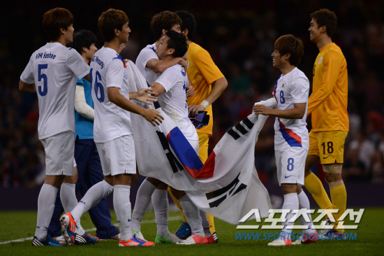 올림픽 축구대표팀 선수들이 10일(현지시간) 영국 카디프 밀레니엄 스타디움에서 열린 일본과의 경기에서 동메달을 획득하고 태극기를 들고 기쁨을 나누고 있다.