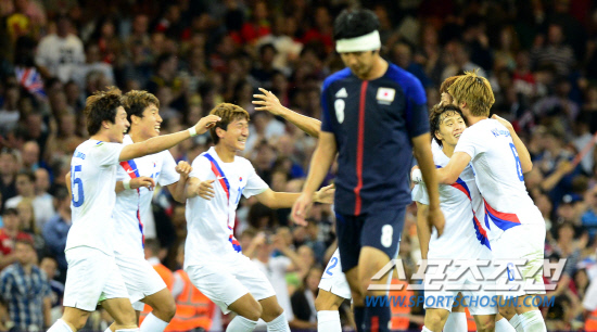 올림픽 축구 대표 선수들이10일 오후(현지시각) 영국 카디프 밀레니엄 스타디움에서 열린 일본과의 경기에서 승리를 확정지은 후 환호하고 있다.