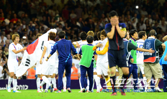 올림픽 축구 대표 선수들이10일 오후(현지시각) 영국 카디프 밀레니엄 스타디움에서 열린 일본과의 경기에서 동메달을 딴 후 대형 태극기를 들고 환호하고 있다.