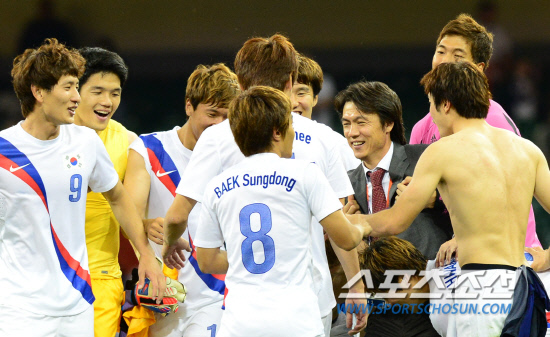 올림픽 축구 대표 선수들이 10일 오후(현지시각) 영국 카디프 밀레니엄 스타디움에서 열린 일본과의 경기에서 동메달을 딴 후 홍명보 감독과 함께 기뻐하고 있다.