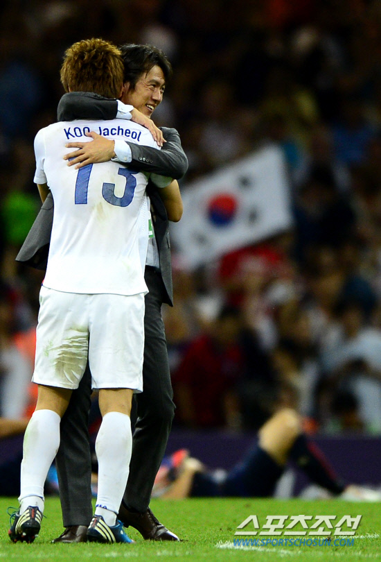 홍명보 감독이 이끄는 올림픽 축구대표팀이 10일 영국 카디프 밀레니엄스타디움에서 열린 일본과 동메달 결정전에서 2대0 승리하며 동메달을 획득했다. 승리가 확정되자 홍명보 감독이 그라운드에 나와 구자철과 포옹을 나누고 있다.