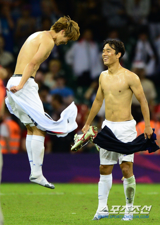 홍명보 감독이 이끄는 올림픽 축구대표팀이 10일 영국 카디프 밀레니엄스타디움에서 열린 일본과 동메달 결정전에서 2대0 승리하며 동메달을 획득했다. 승리가 확정되자 그라운드에서 기성용(왼쪽)과 박주영이 승리 세리머니를 펼치며 기뻐하고 있다.