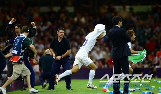 홍명보 감독이 이끄는 올림픽 축구대표팀이 10일 영국 카디프 밀레니엄스타디움에서 열린 일본과 동메달 결정전에서 2대0 승리하며 동메달을 획득했다. 승리가 확정되자 홍명보 감독이 선수들과 환호하며 그라운드를 향해 달려 나가고 있다.
