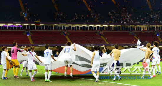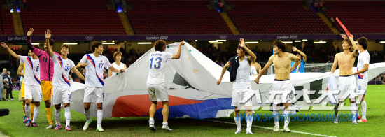 홍명보 감독이 이끄는 올림픽 축구대표팀이 10일 영국 카디프 밀레니엄스타디움에서 열린 일본과 동메달 결정전에서 2대0 승리하며 동메달을 획득했다. 승리가 확정되자 그라운드에서 선수들의 대형태극기를 들고 축하 세리머니를 펼치고 있다.
