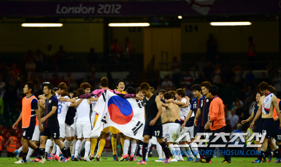 홍명보 감독이 이끄는 올림픽 축구대표팀이 10일 영국 카디프 밀레니엄스타디움에서 열린 일본과 동메달 결정전에서 2대0 승리하며 동메달을 획득했다. 승리가 확정되자 선수들이 태극기를 들고 그라운드를 돌고 기뻐하고 있다.