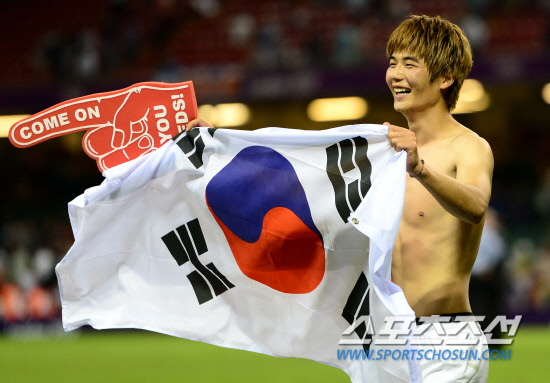 홍명보 감독이 이끄는 올림픽 축구대표팀이 10일 영국 카디프 밀레니엄스타디움에서 열린 일본과 동메달 결정전에서 2대0 승리하며 동메달을 획득했다. 승리가 확정되자 기성용이 태극기를 들고 그라운드를 돌며 팬들에게 인사를 하고 있다.