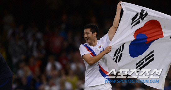 올림픽 축구대표팀 남태희가 10일(현지시간) 영국 카디프 밀레니엄 스타디움에서 열린 일본과의 경기에서 동메달을 획득하고 태극기를 흔들고 있다.