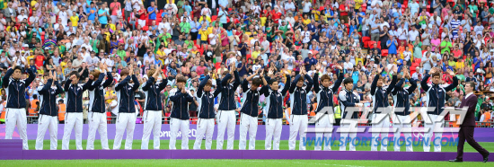 올림픽 축구 역사상 처음으로 동메달을 획득한 대한민국 올림픽 축구 대표팀이 11일(현지시간) 오후 런던 웸블리 스타디움에서 열린 시상식에서 손을 흔들며 관중들의 환호에 답하고 있다. 120811. 런던=올림픽사진공동취재단E
