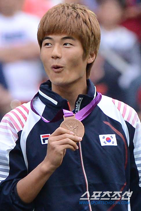 올림픽 축구대표팀 기성용이 11일(현지시간) 영국 런던 웸블리 스타디움에서 열린 시상식에서 동메달을 목에 걸고 재미난 표정을 짓고 있다.
