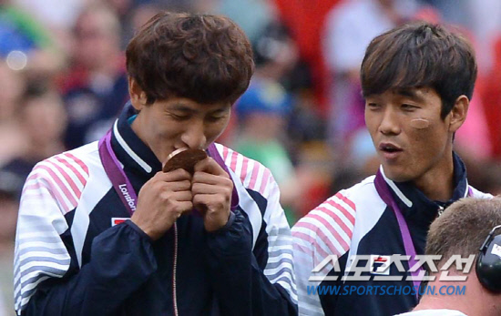 올림픽 축구대표팀 지동원이 11일(현지시간) 영국 런던 웸블리 스타디움에서 열린 시상식에서 동메달에 키스를 하자 박주영이 웃으며 바라보고 있다.