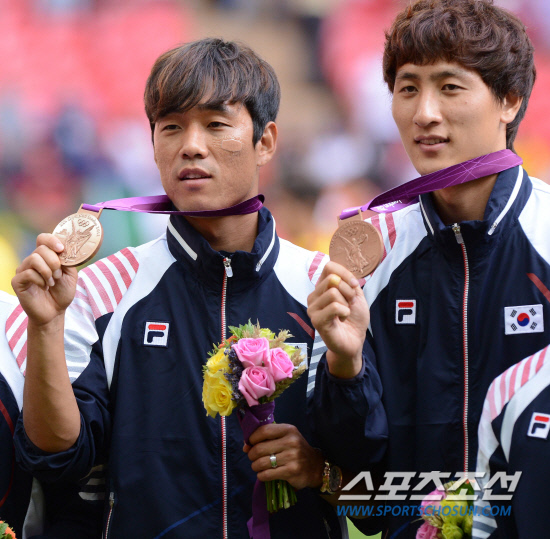 올림픽 축구대표팀 박주영과 지동원이 11일(현지시간) 영국 런던 웸블리 스타디움에서 열린 시상식에서 동메달을 들어 보이며 활짝 웃고 있다.