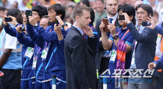 올림픽 축구대표팀 홍명보 감독과 코치진들이 11일(현지시간) 영국 런던 웸블리 스타디움에서 열린 시상식에서 시상대에 오른 선수들의 사진을 찍고 있다.