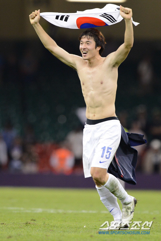올림픽 축구대표팀 박종우가 10일(현지시간) 영국 카디프 밀레니엄 스타디움에서 열린 일본과의 경기에서 승리하고 동메달을 확정한 후 태극기를 들고 그라운드를 돌고 있다.