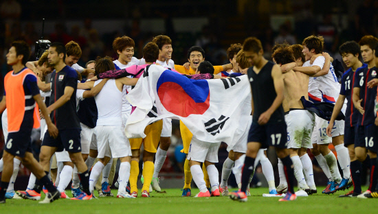 ◇11일(한국시각) 영국 카디프의 밀레니엄 스타디움에서 열린 2012년 런던올림픽 동메달결정전에서 일본을 꺾고 동메달을 차지한 한국 선수단이 기뻐하고 있다. 카디프=올림픽사진공동취재단