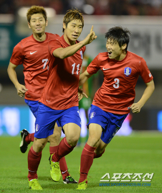 | 최강희 감독이 이끄는 월드컵 대표팀과 '아프리카 챔피언' 잠비아의 평가전이 15일 안양종합운동장에서 열렸다. 후반 이근호가 멋진 왼발슛팅으로 역전골을 터뜨리며 환호하고 있다. 안양=허상욱 기자 wook@sportschosun.com |