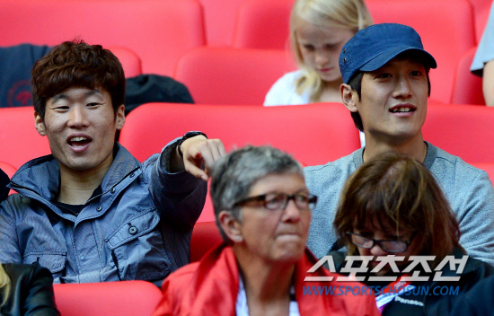 홍명보호가 1일 런던 웸블리스타디움에서 가봉과 조별리그 마지막 경기를 가졌다. 첫 메달에 도전하는 홍명보호는 8강 진출을 위해 가봉과 최후의 결전을 펼쳤다. 박지성(왼쪽)과 이청용이 경기장을 찾아 경기를 관전하고 있다. 20120801런던=올림픽사진공동취재단k