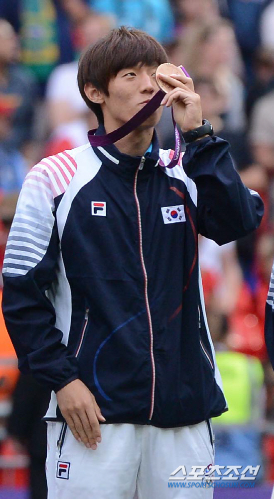 올림픽 축구대표팀 김보경이 11일(현지시간) 영국 런던 웸블리 스타디움에서 열린 시상식에서 동메달을 목에 걸고 바라보고 있다. 20120811 런던=올림픽사진공동취재단d