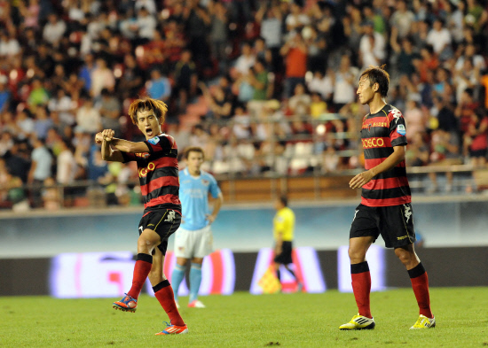 | 포항의 노병준이 19일 홈에서 열린 대구전에서 골을 넣고난 뒤 싸이의 '강남스타일'춤으로 세리머니를 하고 있다. 사진제공=포항 스틸러스 |