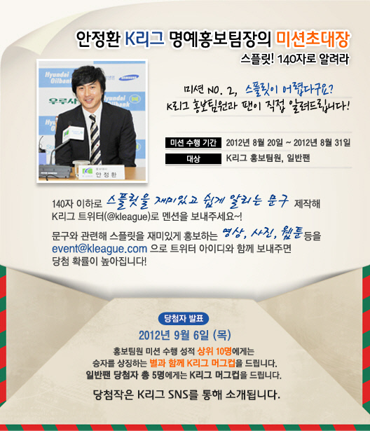 안정환 K-리그 명예 홍보팀장이 올해 새롭게 도입되는 스플릿시스템(Split System)을 쉽고 재미있게 알리기 위해 K-리그 온라인 홍보팀원과 축구팬을 대상으로 '스플릿! 140자로 알려라' 미션을 20일부터 31일까지 진행한다.