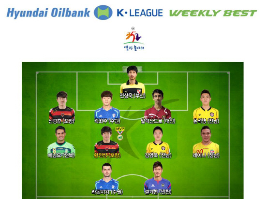 황진성은 레이나(성남) 김영욱(전남), 에닝요(전북)과 함께 이번 라운드 베스트11(4-4-2) 미드필드 부문에도 뽑혔다. 설기현(인천)과 라돈치치(수원)가 최고 공격수 자리에 이름을 올렸다. 베스트 수비수에는 윤석영(전남) 알렉산드로(대전) 곽희주(수원) 신광훈(포항)이 뽑혔다. 이번 라운드 최고 수문장은 전상욱(부산)의 몫이었다. 28라운드 최고의 팀에는 성남(총점 9.7)이 선정됐다. 최고의 경기는 전북-제주전이었다. 이 건 기자 bbadagun@sportschosun.com