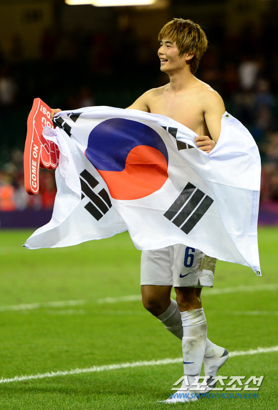 홍명보 감독이 이끄는 올림픽 축구대표팀이 10일 영국 카디프 밀레니엄스타디움에서 열린 일본과 동메달 결정전에서 2대0 승리하며 동메달을 획득했다. 승리가 확정되자 기성용이 태극기를 들고 그라운드를 돌며 팬들에게 인사를 하고 있다. 20120810카디프=올림픽사진공동취재단k