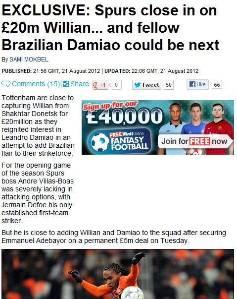 윌리엄은 거듭된 샤흐타르의 이적 거부에 단단히 뿔이 나있다. 올여름 첼시가 적극적인 러브콜을 보냈지만, 너무 높은 몸값 때문에 포기한 바 있다. 토트넘은 2000만파운드의 이적료를 제시하며 샤흐타르의 마음을 어느정도 돌린 것으로 알려졌다. 윌리엄도 과거 인터뷰를 통해 런던에서 뛰고 싶다는 의사를 밝힌 바 있어 이적이 빨리 마무리 될 가능성이 높다. 안드레 비야스 보아스 감독은 윌리엄을 레알 마드리드행이 유력한 루카 모드리치의 대체자로 활용할 예정이다.