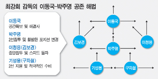 최 감독은 "이동국과 박주영은 과거 본프레레호에서 같이 뛴 적이 있다. 쿠웨이트전에서도 90분을 함께 했다. 당시 둘의 호흡은 만족할 만한 수준이 아니었다. 두 선수가 다른 특징을 가지고 있다. 현대 축구는 원톱을 세우고 다른 선수가 배후에서 따라 들어가는 것이 대세다. 훈련을 통해 확인할 것이다. 공존 해법도 찾을 수 있다"고 말했다.