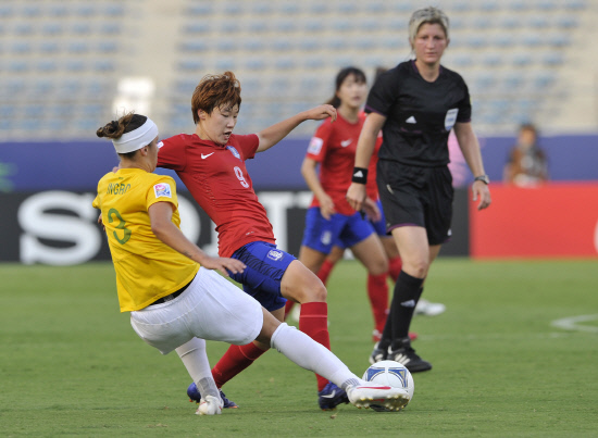 | ◇FIFA가 달아오른 한-일 양국 간의 관계가 한-일전에 미칠 여파에 주목하고 있다. 26일 일본 도쿄 국립경기장에서 열린 브라질과의 2012년 여자청소년월드컵(20세 이하) 본선 조별리그 B조 최종전에서 공격수 이금민(가운데)이 슛을 시도하고 있다. 사진제공=대한축구협회 |