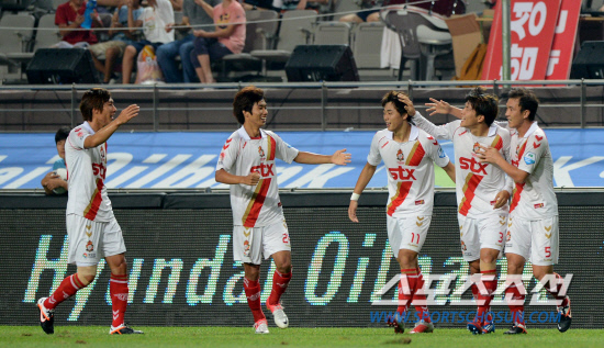 서울과 경남의 현대오일뱅크 K리그 2012 경기가 8일 서울월드컵경기장에서 열렸다. 경남 김인한(11번)이 전반 선취골을 성공한 후 기쁨을 나누고 있다. 상암=허상욱 기자 wook@sportschosun.com/2012.08.08/ |