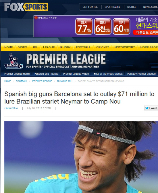 브라질 '신성' 네이마르(20·산토스)의 몸값으로 천문학적인 액수가 나왔다. 7100만달러(약 800억원)다.