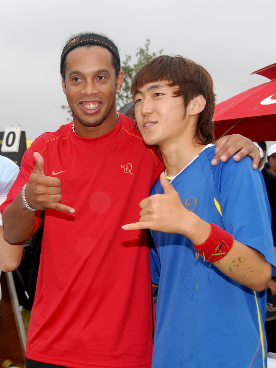 프리스타일러 전 권이 세계 최고 권위의 프리스타일 대회에서 최연소 심사위원으로 위촉됐다. 전 권은 그동안 프리스타일계 최고의 스타로 자리를 공고히 해왔다. 사진은 호나우디뉴와 함께 프리스타일 공연을 한 뒤 기념촬영을 하고 있는 전 권. 사진제공=JK 아트사커 아카데미