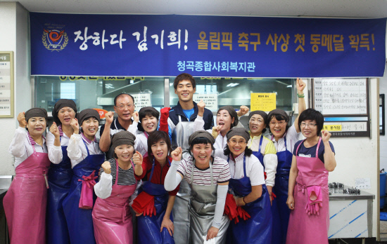 서로 김기희에게 다가와 사인을 요청하고 기념 사진을 찍었다. "사위를 삼고 싶다"면서 "여자친구는 있느냐"고 묻는 아주머니도 있었다. 앞치마를 매준 아주머니는 자연스럽게 백허그를 하면서 즐거워하기도 했다. 아주머니들의 적극적인 애정 공세(?)에 김기희는 얼굴을 붉히기도 했다. 아주머니들은 김기희에게 배식 봉사 요령은 물론이고 여러가지 인생의 조언을 해주면서 즐거운 시간을 보냈다. 김기희로부터 배식을 받은 어르신들도 김기희를 알아봤다. 음식을 받으면서 "올림픽을 잘 봤다. 감동을 안겨다주어서 너무나 고맙다"고 했다.