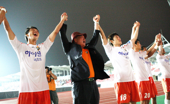 | ◇남종현 강원 대표이사가 지난 6월 30일 경기도 성남 탄천종합운동장에서 펼쳐진 성남 일화와의 2012년 K-리그 경기에서 2대1 승리가 확정되자 선수들과 함께 손을 잡고 관중들에게 인사하고 있다. 사진제공=강원FC |