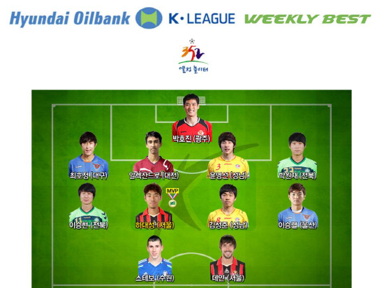 연맹은 MVP와 함께 32라운드 베스트 11(4-4-2)도 공개했다. 투톱에는 데얀(서울)과 스테보(수원), 하대성을 비롯해 이승렬(울산) 이승현(전북) 김성준(성남이 최고의 미드필더로 선정됐다. 베스트 수비와 수문장은 박원재(전북) 윤영선(성남) 알렉산드로(대전) 최호정(대구)과 박호진(광주)이었다.
