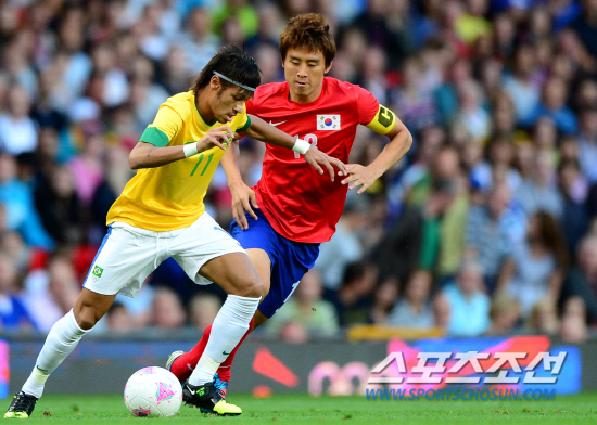 결승 진출에 도전하는 홍명보호가 7일 맨체스터 올드트라포드경기장에서 브라질과 대결을 펼쳤다. 구자철이 브라질 네이마르와 볼 다툼을 벌이고 있다. 20120807맨체스터=올림픽사진공동취재단