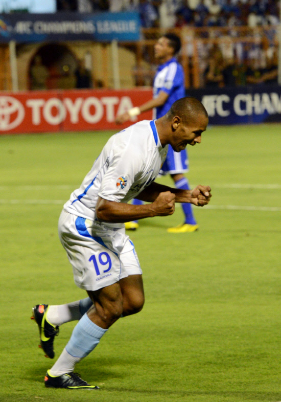 울산 현대 하피냐 선수가 4일 새벽(한국시간) 사우디 리야드 프린스 파이살 빈 파드 스타디움에서 사우디 알 힐랄 팀을 상대로 열린 AFC 챔피언스리그 8강 2차전 경기에서 첫번째 골을 넣은 뒤 주먹을 불끈 쥐고 있다. 2012.10.4/사진공동취재단