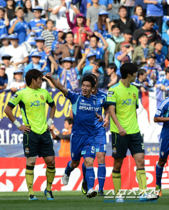 K리그 슈퍼매치 수원과 서울의 현대오일뱅크 K리그 2012 34라운드 경기가 3일 수원월드컵경기장에서 열렸다. 수원 오장은(9번)이 후반 선제골을 터뜨린 후 기쁨을 나누고 있다. 1위 서울은 스플릿 리그 3연승을 포함해 최근 5연승의 고공행진 중이다. 4위 수원은 스플릿 리그에서 1승2패를 기록하고 있지만 서울에 6연승을 달리고 있어 연승을 이어갈지 관심이 집중되고 있다. 수원=허상욱 기자 wook@sportschosun.com