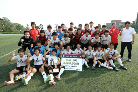| ◇지난달 22일 K-리그 유스팀만이 대결하는 '아디다스 올인 챌린지리그' B조 1위를 차지한 포항 스틸러스 유스팀(포철공고). 대회 1~7위팀은 전국 고교리그 왕중왕전에 직행한다. 사진제공=프로축구연맹 |