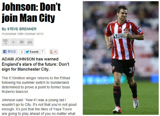 아담 존슨(선덜랜드)이 잉글랜드의 유망주들에 경고했다. 존슨은 올여름 이적시장에서 맨시티를 떠나 선덜랜드로 이적했다. 복수의 영국 일간지는 6일(한국시각) 존슨의 인터뷰를 실었다, 존슨은 인터뷰에서 "내가 유망주라면 맨시티로 가지 않을 것이다. 네가 야야 투레보다 좋은 선수라면 상관없다. 그러나 젊은 영국 선수라면 충분한 기회를 얻지 못할 것이라고 충고하고 싶다"고 말했다.