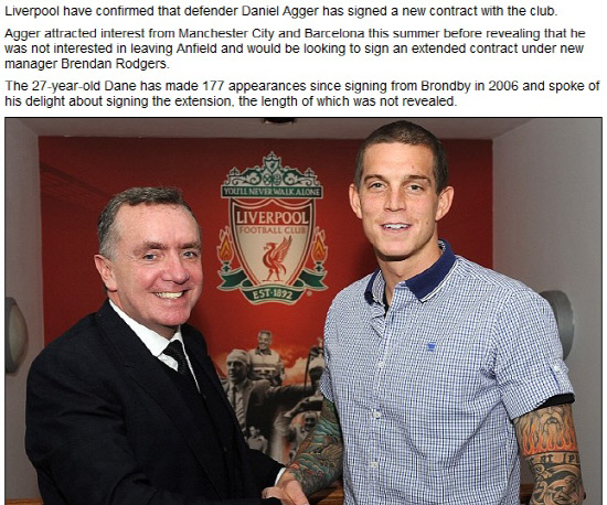 아게르는 6일(한국시각) 공식 홈페이지를 통해 "나는 리버풀에서 행복하다. 나는 결코 떠나길 원하지 않았다. 나는 미래에 리버풀의 한부분이 되길 원한다"며 재계약 사실을 알렸다. 아게르는 올여름 맨시티와 바르셀로나의 강력한 러브콜을 받았지만, 리버풀에서 선수생활을 이어가기로 결정했다. 아게르의 계약 기간은 밝혀지지 않았다.